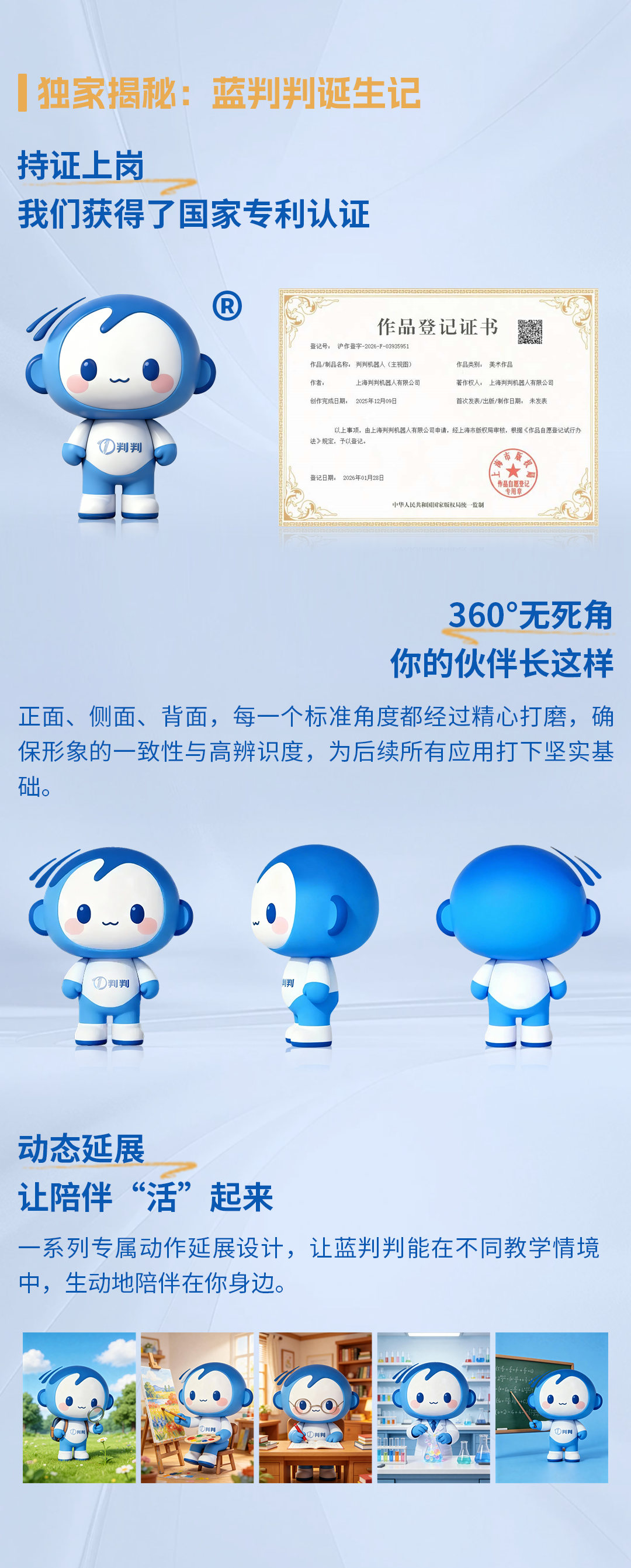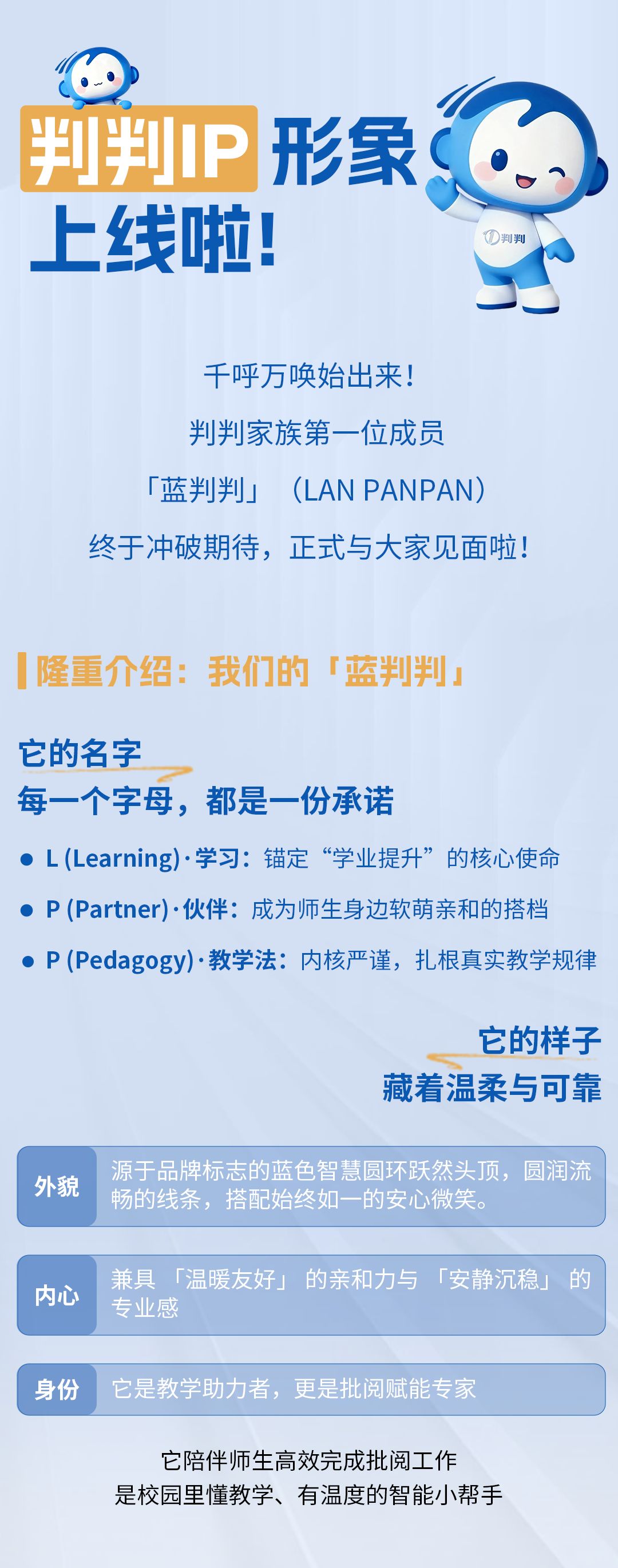 判判机器人 您的数智校园好友 上海判判机器人有限公司,最初专注为客户提供Saas信息技术服务与解决方案,助力企业数字化转型。后以“科技驱动教育,智慧引领未来”为企业愿景,深耕教育科技领域,于2023年9月推出判判智能批阅助教机。 团队以OCR、算法比对、图像处理、机器学习、文字处理等技术为基础,将人工智能能力与数据管理分析相整合,成功推出了从快速自动批改到学情分层跟踪的系统解决方案,并真正实现个性化教学的完整闭环。 截至目前为止,判判已在全国500+所中小学正在使用,推动教育行业加快完成“人工智能+教育”的应用。 咨询热线:4008-5050-26