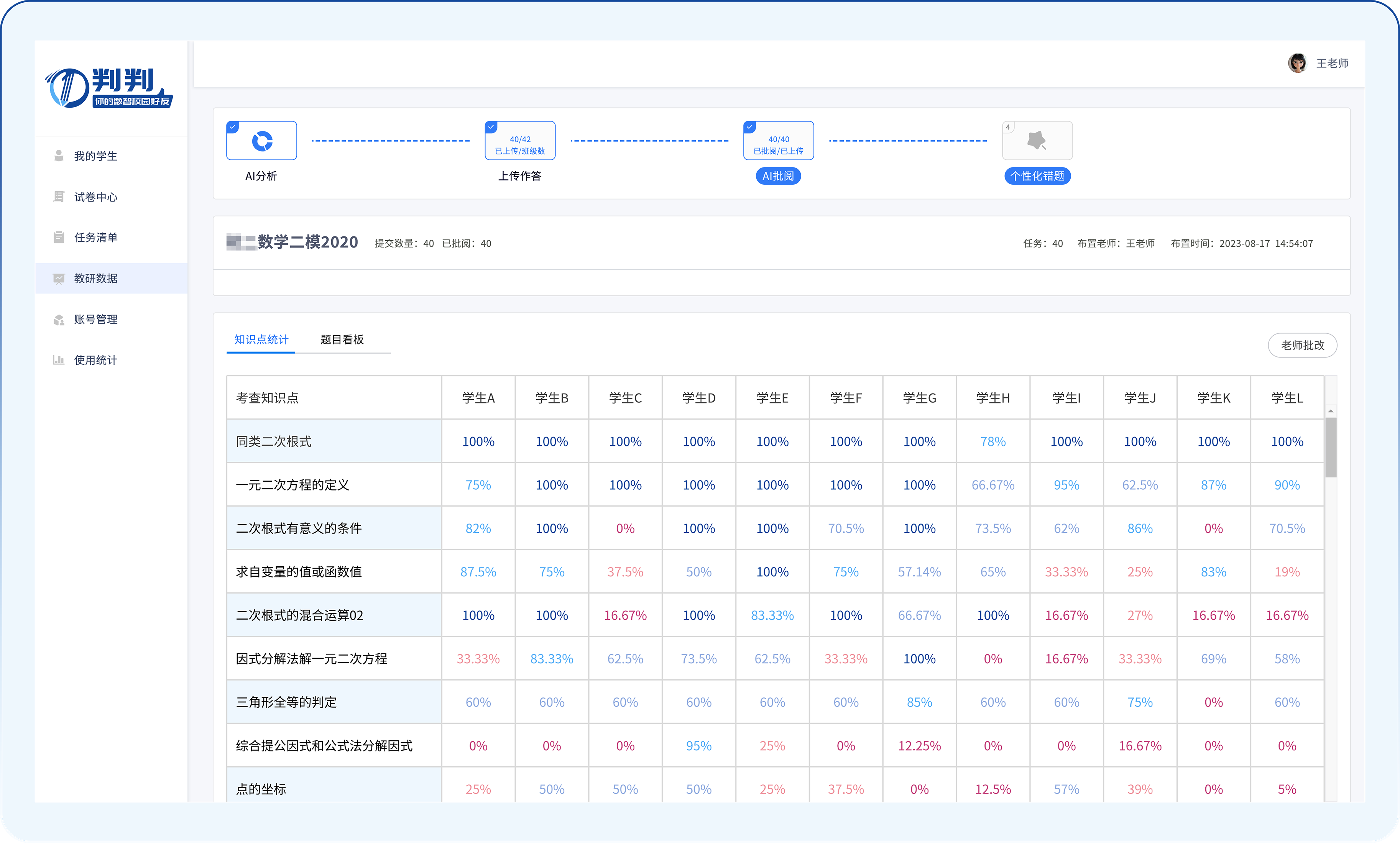 AI全自动批改:支持多学科(数/语/英等)作业、试卷的智能识别与批改,速度可达人工10倍以上。 精准纠错:结合OCR与深度学习,准确识别手写答案、复杂公式及作文语法错误,减少人工复核。